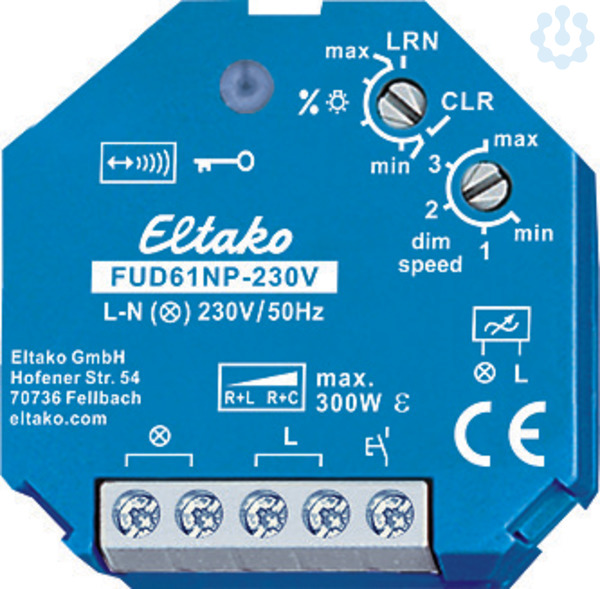 Funkaktor Universal-Dimmschalter ohne N, 230V. Ohne N-Anschluss, Power MOSFET bis 300W. Stand-by-Verlust nur 0,7 Watt. Mindesthelligkeit und Dimmgeschwindigkeit einstellbar. Mit Kinderzimmer- und Schlummerschaltung. Lichtszenen einlernbar. Verschlüsselter Funk, bidirektionaler Funk und Repeater-Funktion zuschaltbar. Für Einbaumontage. 45mm lang, 45mm breit, 33mm tief. Universal-Dimmschalter für R-, L- und C-Lasten bis 300W, abhängig von den Lüftungsverhältnissen. Automatische Erkennung der Lastart R+L oder R+C. Ohne N-Anschluss, daher zur Montage direkt hinter dem Lichttaster geeignet, auch wenn keine N-Leitung vorhanden ist. Für Energiesparlampen ESL und 230V-LED-Lampen nicht geeignet, bitte den Dimmer FUD61NPN mit N-Anschluss verwenden. Versorgungs-, Schalt- und Steuerspannung örtlich 230V. Mindestlast nur 40W. Schaltung im Nulldurchgang mit Soft-Ein und Soft-Aus zur Lampenschonung. Die eingestellte Helligkeitsstufe bleibt beim Ausschalten gespeichert (Memory). Bei einem Stromausfall wird die Schaltstellung