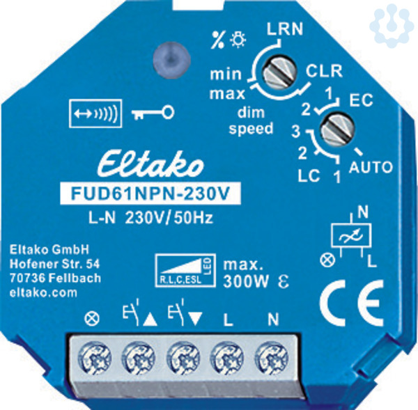 Universal-Dimmschalter, Power MOSFET bis 300W. Automatische Lampenerkennung. Stand-by-Verlust nur 0,7 Watt. Mindesthelligkeit oder Dimmgeschwindigkeit einstellbar. Mit Kinderzimmer-, Schlummer- und Lichtweckerschaltung. Zusätzlich mit Lichtszenensteuerung. Verschlüsselter Funk, bidirektionaler Funk und Repeater-Funktion zuschaltbar. Für Einbaumontage. 45mm lang, 45mm breit, 33mm tief. Universal-Dimmschalter für Lampen bis 300W, abhängig von den Lüftungsverhältnissen. Dimmbare Energiesparlampen ESL und dimmbare 230V-LED-Lampen zusätzlich abhängig von der Lampenelektronik. Schaltung im Nulldurchgang mit Soft-Ein und Soft-Aus zur Lampenschonung. Versorgungs-, Schalt- und Steuerspannung örtlich 230V. Keine Mindestlast erforderlich. Die eingestellte Helligkeitsstufe bleibt beim Ausschalten gespeichert (Memory). Bei einem Stromausfall werden die Schaltstellung und die Helligkeitsstufe gespeichert und wird gegebenenfalls bei Wiederkehr der Versorgungsspannung eingeschaltet. Automatische elektronische Überlastsicheru