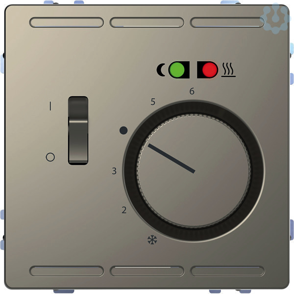 Für System Design. Für elektrische Fußbodenheizung mit NTC Fühler. Bereichsbegrenzung im Einstellknopf integriert. Mit Fernfühler an 4 m Zuleitung, verlängerbar mit 2-adrigem Kabel. Mit Schraubbefestigung. Mit Steckklemmen. Funktionen -Mit Schalter und Kontrollleuchten. 1xSchließerkontakt. Schaltdifferenz 1 K. Temperaturbereich ca. 10-50 GradC. Anschluss für zeitgesteuerte Nachtabsenkung um ca. 5 K. Nennspannung AC 230 V. Nennstrom (Ohmsch) 10 A. Nennstrom (Induktiv) 4 A, cos Phi 0,6. Schaltleistung Heizen 2300 W. Material Metall. Farbe Nickelmetallic.