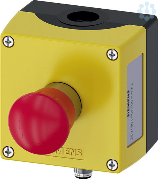 Gehäuse für Befehlsgeräte 22 mm, rund, Gehäusematerial Kunststoff, Gehäuseoberteil gelb, 1 Befehlsstelle, Kunststoff, A=NOT-HALT-Pilzdrucktaster rot, 40 mm, drehentriegelt, 1Ö, 1Ö, Federzuganschluss, Bodenbefestigung, verdrahtet, ohne Schild, unten M12-Stecker 4-polig, Gehäuse SIRIUS ACT für die Montage der 22,5 mm Befehls- und Meldegeräte bei räumlich getrennter Anordnung von Steuereinheiten und Schaltschränken.Unter dem Markennamen SIRIUS ACT bietet Siemens ein einzigartiges Portfolio an Befehls- und Meldegeräten mit weltweiten Produkt-Zulassungen in vier modernen Designreihen aus robustem Echtmetall und hochwertigem Kunststoff.Das innovative Aufschnappkonzept vereinfacht die Montage so weit, dass dafür nur eine Hand und kein Spezialwerkzeug erforderlich ist. Als Montagebohrungen genügen nutfreie Löcher, da bereits ein 100%iger Verdrehschutz integriert ist.Dank der durchgängig hohen Schutzart sind die robusten Geräte industrietauglich und für den Außeneinsatz geeignet. Sogar die Reinigung mit Hochdruckstrah