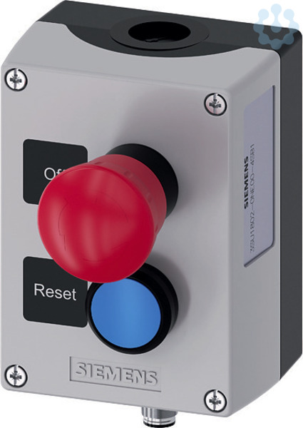 Gehäuse für Befehlsgeräte, 22 mm, rund, Gehäusematerial Kunststoff, Gehäuseoberteil grau, 2 Befehlsstellen Kunststoff, B=NOT-HALT-Pilzdrucktaster rot, 40 mm, drehentriegelt, 2x 1Ö, Schild schwarz Off, A= Drucktaster, blau, 1S, Schild schwarz Reset, Federzuganschluss, Bodenbefestigung, M12-Stecker (8-polig) unten, isolierte Reserveadern, Steckerbelegung: PIN1=11, PIN2=12, PIN3=21, PIN4=22, PIN5=13, PIN6=n.c. PIN7=n.c., PIN8=14, zwei Anschlüsse an 2 Eingänge F-DI, Schilder lose beigelegt Gehäuse SIRIUS ACT für die Montage der 22,5 mm Befehls- und Meldegeräte bei räumlich getrennter Anordnung von Steuereinheiten und Schaltschränken.Unter dem Markennamen SIRIUS ACT bietet Siemens ein einzigartiges Portfolio an Befehls- und Meldegeräten mit weltweiten Produkt-Zulassungen in vier modernen Designreihen aus robustem Echtmetall und hochwertigem Kunststoff.Das innovative Aufschnappkonzept vereinfacht die Montage so weit, dass dafür nur eine Hand und kein Spezialwerkzeug erforderlich ist. Als Montagebohrungen genügen nu