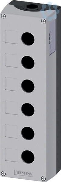 Gehäuse für Befehlsgeräte, 22 mm, rund, Gehäusematerial Metall, Gehäuseoberteil grau, 6 Befehlsstellen, ohne Bestückung, Vertiefung für Schilder, Bodenbefestigung, oben und unten je 1xM25 Gehäuse SIRIUS ACT für die Montage der 22,5 mm Befehls- und Meldegeräte bei räumlich getrennter Anordnung von Steuereinheiten und Schaltschränken.Unter dem Markennamen SIRIUS ACT bietet Siemens ein einzigartiges Portfolio an Befehls- und Meldegeräten mit weltweiten Produkt-Zulassungen in vier modernen Designreihen aus robustem Echtmetall und hochwertigem Kunststoff.Das innovative Aufschnappkonzept vereinfacht die Montage so weit, dass dafür nur eine Hand und kein Spezialwerkzeug erforderlich ist. Als Montagebohrungen genügen nutfreie Löcher, da bereits ein 100%iger Verdrehschutz integriert ist.Dank der durchgängig hohen Schutzart sind die robusten Geräte industrietauglich und für den Außeneinsatz geeignet. Sogar die Reinigung mit Hochdruckstrahl ist möglich. Weder Staub, Öle noch aggressive Laugen können den zuverlässigen Be