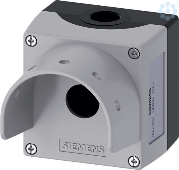 Gehäuse für Befehlsgeräte, 22 mm, rund, Gehäusematerial Metall, Gehäuseoberteil grau, mit Schutzkragen für 5 Vorhängeschlösser und Pilzdurchmesser 60 mm, 1 Befehlsstelle, ohne Bestückung, Bodenbefestigung, oben und unten je 1xM20 Gehäuse SIRIUS ACT für die Montage der 22,5 mm Befehls- und Meldegeräte bei räumlich getrennter Anordnung von Steuereinheiten und Schaltschränken.Unter dem Markennamen SIRIUS ACT bietet Siemens ein einzigartiges Portfolio an Befehls- und Meldegeräten mit weltweiten Produkt-Zulassungen in vier modernen Designreihen aus robustem Echtmetall und hochwertigem Kunststoff.Das innovative Aufschnappkonzept vereinfacht die Montage so weit, dass dafür nur eine Hand und kein Spezialwerkzeug erforderlich ist. Als Montagebohrungen genügen nutfreie Löcher, da bereits ein 100%iger Verdrehschutz integriert ist.Dank der durchgängig hohen Schutzart sind die robusten Geräte industrietauglich und für den Außeneinsatz geeignet. Sogar die Reinigung mit Hochdruckstrahl ist möglich. Weder Staub, Öle noch agg