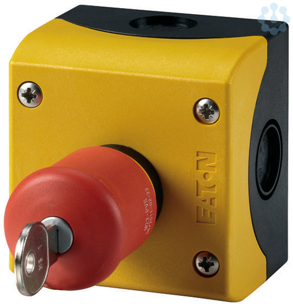 Gehäuse, Sortiment: RMQ-Titan, Komplettgerät, Bauform: Pilzform, Durchmesser: 38 mm, unbeleuchtet, Schlüsselentriegelung, Anschlussart: Schraubanschluss, Beschreibung: überlistungssicher nach ISO 13850/EN 418, Befehlsstellen: 1 Anzahl, Farbe Pilzstößel: rot, Farbe Gehäusedeckel: gelb, Schutzart: IP66, IP67, IP69K, Anbindung an SmartWire-DT: nein, Kontaktbestückung Ö = Öffner: 1 Ö, Kontaktbestückung S = Schließer: 1 S, Kontaktbestückung Hinweis = Sicherheitsfunktion, durch Zwangsöffnung nach IEC/EN 60947-5-1, Weg des Bedienteils und Betätigungskraft nach DIN EN 60947-5-1, K.5.4.1 Zwangsöffnungsweg: mm 4.8, maximaler Weg: mm 5.7, Mindestkraft für Zwangsöffnung: N 20, Zwangsöffnung (ZW): ja, Frontabmessung: 35, Information zum Lieferumfang: 1 Schlüssel im Lieferumfang enthalten, Normen und Bestimmungen: IEC/EN 60947, VDE 0660, Einbaulage: beliebig