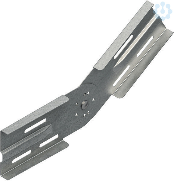 Gelenkverbinder, vertikal, zur Herstellung von vertikalen Winkelverbindungen von durchlaufenden Weitspannkabelrinnen/-leitern, einschließlich feuerverzinkten anteilmäßigem Befestigungszubehör. Der Potentialausgleich erfolgt durch die Verschraubung mit den Weitspannkabelrinnen/-leiterholmen sowie den Formstückholmen. Stoßstellen müssen in unmittelbarer Nähe durch eine entsprechende Tragkonstruktion unterstützt werden.