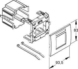 Set besteht aus: 1 x Schutzdose, einfach, grau 1 x Geräteadapter, einfach, Modul 45, mit 4 Federclips 1 x Abdeckrahmen, einfach, Modul 45, einschließlich Sichtfenster mit Etikett für Beschriftungsfeld 2 x Kabelbinder für die Zugentlastung