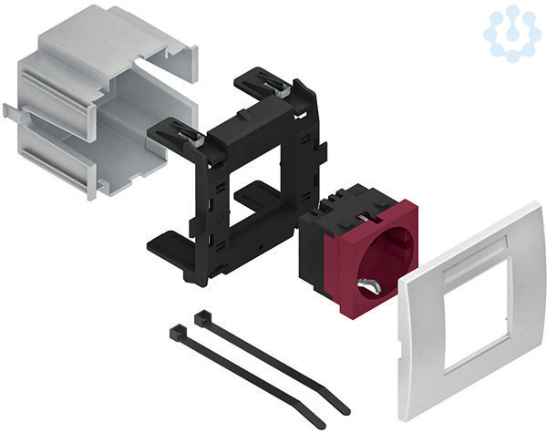 Set besteht aus: 1 x Schutzdose, einfach, grau 1 x Geräteadapter, einfach, Modul 45, mit 4 Federclips 1 x Steckdoseneinsatz, einfach, waagerecht, mit Steckklemmen für Leitungen 1,5 - 2,5 mm², 2-polig, mit Berührungsschutz 1 x Abdeckrahmen, einfach, Modul 45, einschließlich Sichtfenster mit Etikett für Beschriftungsfeld 2 x Kabelbinder für die Zugentlastung 1 x Montageanleitung