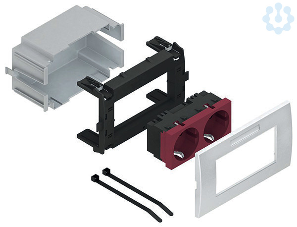 Set besteht aus: 1 x Schutzdose, zweifach, grau 1 x Geräteadapter, zweifach, Modul 45, mit 4 Federclips 1 x Steckdoseneinsatz, zweifach, waagerecht, mit Steckklemmen für Leitungen 1,5 - 2,5 mm², 2-polig, mit Berührungsschutz 1 x Abdeckrahmen, zweifach, Modul 45, einschließlich Sichtfenster mit Etikett für Beschriftungsfeld 2 x Kabelbinder für die Zugentlastung 1 x Montageanleitung