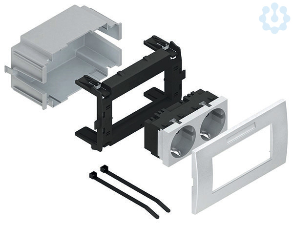 Set besteht aus: 1 x Schutzdose, zweifach, grau 1 x Geräteadapter, zweifach, Modul 45, mit 4 Federclips 1 x Steckdoseneinsatz, zweifach, waagerecht, mit Steckklemmen für Leitungen 1,5 - 2,5 mm², 2-polig, mit Berührungsschutz 1 x Abdeckrahmen, zweifach, Modul 45, einschließlich Sichtfenster mit Etikett für Beschriftungsfeld 2 x Kabelbinder für die Zugentlastung 1 x Montageanleitung