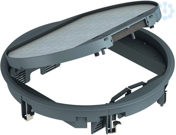Geräteeinsatz rund für 9 Standard- (Bauform EK) oder 12 Modul-45-Installationsgeräte in 3 Gerätebecher GB3, für den universellen Einsatz in Kanalsystemen, Doppel- und Hohlböden im Innenbereich. Einbauöffnung Ø = 305 mm. Teppichschutzrahmen, Klappdeckel und Schnurauslass aus Polyamid. Für Bodenbelageinlegestärke 5 mm. Alternativ einstellbar auf 3, 10 oder 12 mm.