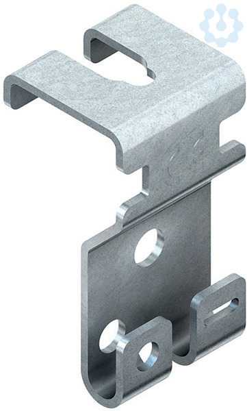 Gitterrinnen-Abhängebügel, zur zweiseitigen Abhängung der Gitterrinnen mittels Gewindestab M 10, der Einsatz des Abhängebügels erfolgt an Schnittstellen zwischen Längs- und Querdrähten. Zur Sicherung gegen das Aushebeln der Gitterrinne aus dem Abhängebügel kann die Lasche, mittels eines Schraubendrehers, umgelegt werden.