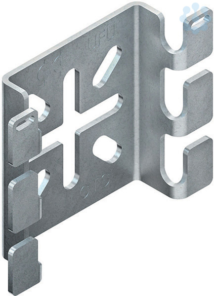 Gitterrinnen-Montagebügel, zur schraubenlosen Wandmontage (Einhängen) der Gitterinnen mit einer Breite ? 100 mm und mind. zwei seitlichen Längsdrähten mit einem mittigen Abstand von 25 mm bzw. 50 mm, zur mittigen Gewindestababhängung von Gitterrinnen bis zu einer Breite ? 300 mm und mind. zwei Längsdrähten im Boden mit einem mittigen Abstand von 25 mm bzw. 50 mm sowie zum Anbau von Verteiler- und Abzweigdosen.