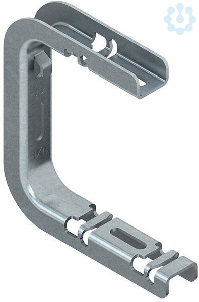 Gitterrinnen-Abhängebügel, C-Bügel, zur zentralen Deckenabhängung der Gitterrinnen mittels Gewindestab M 6. Doppelfunktion der Zentralabhängung durch Drehung um die vertikale Achse, verwendbar für Gitterrinnen mit einem sowie mit zwei Bodenlängsdrähten, Zur Aushebelsicherung den Bügel mittels eines Schraubendrehers umgelegen. Die Tragfähigkeitsangaben gelten nur bei ausreichender Verankerung mit dem tragenden Untergrund.