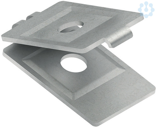 Gitterrinnenbefestigungsklammer, einstückig, zur variablen Seitenbefestigung (Gitterrinnenbreite ? 100 mm und seitlichem Längsdrahtabstand von 25 bzw. 50 mm) und Bodenbefestigung von Gitterinnen, eine zusätzliche mittige Lochung ermöglicht zudem eine Abhängung mittels Gewindestab M 10 (Gitterrinnenbreite ? 300 mm), Gitterrinnen der Größen GR 40.040, GRS 60.060, GRCI 50.050 und MTCG 50.100 erhalten eine variable Befestigungsmöglichkeit. Befestigungszubehör muss je nach Anwendungsfall gesondert bestellt werden.