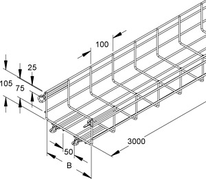 Gitterrinne nach DIN EN 61537, U-förmig, aus Stahldrähten, punktgeschweißt, zur Schnellbefestigung mit angeschweißten Stoßstellenverbindern in den Seiten und im Boden. VDE zertifiziert! MTC ... E4 auf Anfrage.