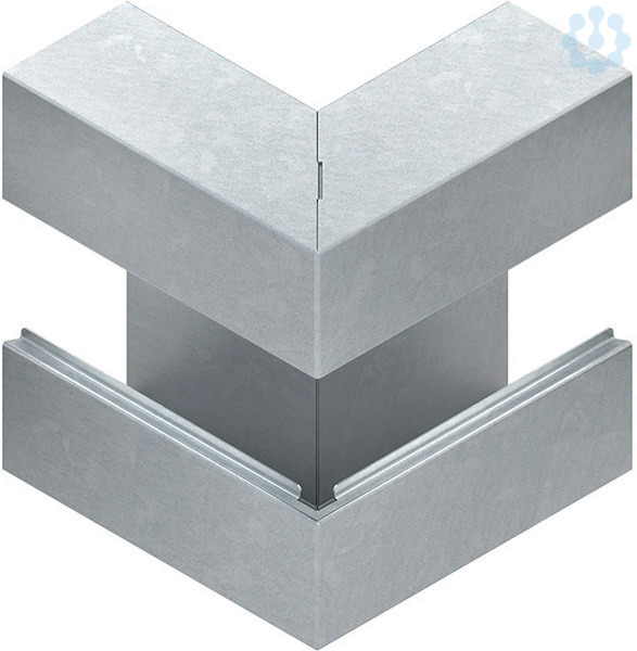 Gerätekanal-Außeneck 90°, aus bandverzinktem Stahl nach DIN EN 10346, Sichtflächen in RAL Farbton gemäß Herstellerkatalog elektrostatisch pulverbeschichtet, ohne Bodenlaschen für die Aufnahme der Trennstege, der Potentialausgleich erfolgt über die