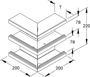 Doppelzügiges Gerätekanal-Außeneck 90°, aus bandverzinktem Stahl nach DIN EN 10346, Sichtflächen in RAL Farbton gemäß Herstellerkatalog elektrostatisch pulverbeschichtet, ohne Bodenlaschen für die Aufnahme der Trennstege, mit zwei, mittels nachträglich montierbarem, selbstkontaktierenden Trennprofil aus Aluminium, getrennten gleich großen Leitungszügen, der Potentialausgleich erfolgt über die
