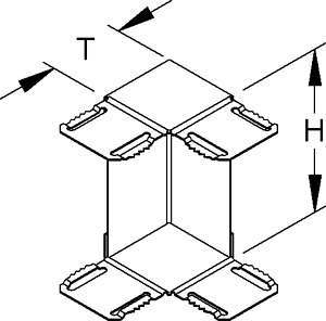 Gerätekanal-Inneneckeinsatz 90°, aus bandverzinktem Stahl nach DIN EN 10346, Sichtflächen in RAL Farbton gemäß Herstellerkatalog elektrostatisch pulverbeschichtet, ohne Bodenlaschen für die Aufnahme der Trennstege, der Potentialausgleich erfolgt zwangsläufig beim Einschieben in den Gerätekanal. VDE zertifiziert!