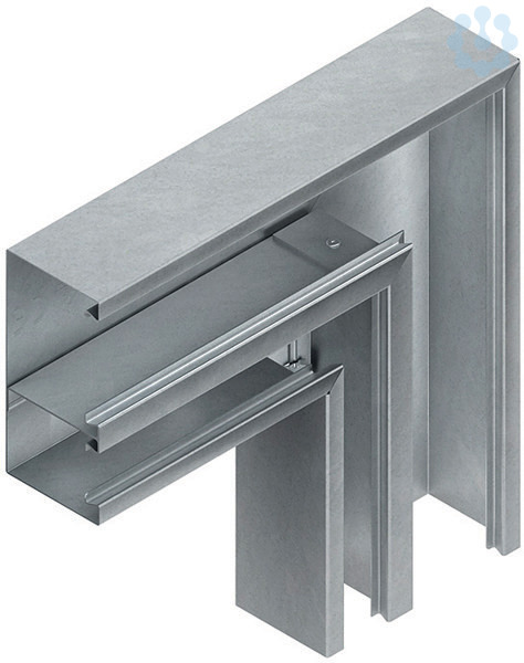 Doppelzügiges Vertikaleck 90°, aus bandverzinktem Stahl nach DIN EN 10346, Sichtflächen in RAL Farbton gemäß Herstellerkatalog elektrostatisch pulverbeschichtet, ohne Bodenlaschen für die Aufnahme der Trennstege, mit zwei, mittels nachträglich montierbarem, selbstkontaktierenden Trennprofil aus Aluminium getrennten, unterschiedlich großen Leitungszügen, der Potentialausgleich erfolgt über die zwangsläufig kontaktierenden Stoßstellenverbinder DSTE.../DSTA..., bitte gesondert bestellen. VDE zertifiziert!