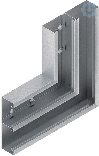 Doppelzügiges Vertikaleck 90°, aus bandverzinktem Stahl nach DIN EN 10346, mit zwei mittels nachträglich montierbarem, selbstkontaktierenden Trennprofil aus Aluminium, getrennten, gleich großen Leitungszügen, der Potentialausgleich erfolgt über die
