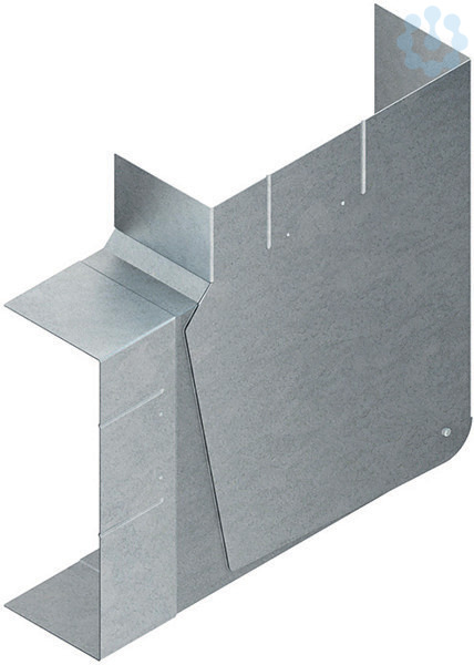 Gerätekanal-Vertikaleck, verstellbar, asymmetrisch mit einem Abgang nach oben, schwenkbare Schenkel ermöglichen einen Ausgleich von Winkeltoleranzen im Bereich von 85°-95°, aus bandverzinktem Stahl nach DIN EN 10346, zum Aufsetzen auf den Gerätekanal, Potentialausgleichsleitung GSLH... und zwangsläufig kontaktierende Stoßstellenverbinder GSTA... oder Potentialausgleichsklemme GPK 63 müssen gesondert bestellt werden.