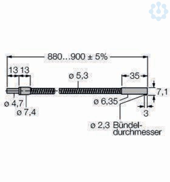Glas-Lichtleiter, Einzelleiter, Gesamtlänge des Lichtleiters: ± 914 mm, Betriebsart: Einweglichtschranke, Edelstahlummantelung, flexibel, Betriebstemperatur: -140...+249 °C, Lichtleiter-Bündeldurchmesser: 2.56 mm, Fühler-Endhülse: abgewinkelt (90°)