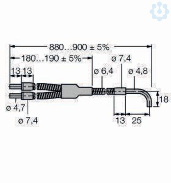Glas-Lichtleiter, Gabelleiter, Gesamtlänge des Lichtleiters: ± 914 mm, Betriebsart: Reflexionslichttaster / -schranke, Edelstahlummantelung, flexibel, Betriebstemperatur: -140...+249 °C, Lichtleiter-Bündeldurchmesser: 3.2 mm, Fühler-Endhülse: abgewinkelt (90°)