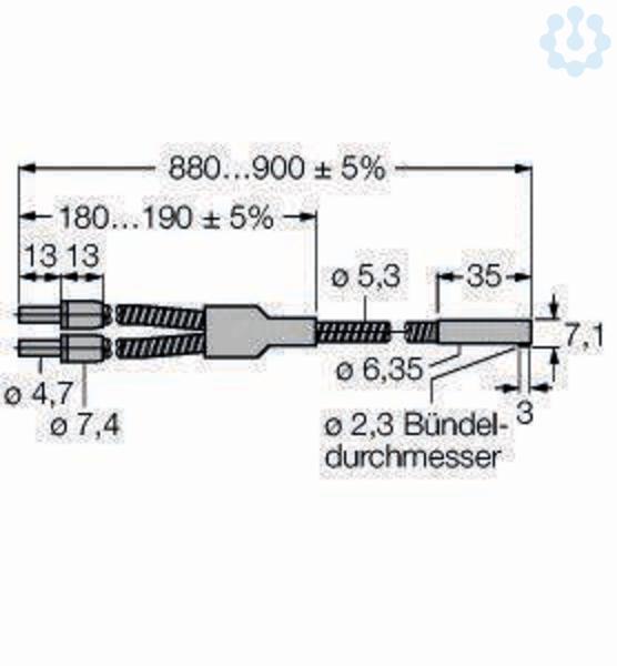 Glas-Lichtleiter, Gabelleiter, Gesamtlänge des Lichtleiters: ± 914 mm, Betriebsart: Reflexionslichttaster / -schranke, Edelstahlummantelung, flexibel, Betriebstemperatur: -140...+249 °C, Lichtleiter-Bündeldurchmesser: 2.56 mm, Fühler-Endhülse: abgewinkelt (90°)