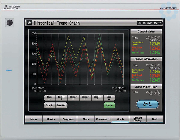 TFT-Display, 65 K Farben mit SVGA Auflösung und bis zu 128 MB internem Speicher. Das Gerät verfügt über Ethernet, USB, RS232 und RS422/485 Schnittstelle, sowie einen SD Kartensteckplatz. Zusätzlich kann das GT27 mit optionalen Schnittstellen wie CC-Link IE, CC-Link IE Field*, CC-Link, MELSECNET/H und einer direkten SPS Busanbindung ausgestattet werden. Es bietet umfangreiche vorgefertigte Diagnose- und Troubleshooting-Funktionen, wie Backup/Restore, SPS Programm Monitor, Device Monitor, Netzwerk Monitor, Servo/Motion Monitor, Motion SFC Monitor und CNC Monitor. Besondere Funktionen: Multi-Touch/Gestensteuerung, Multimedia Funktion, Debugging, Anzeigefunktion für Dokumente, Remote Zugriff auf das GOT (VNC-Server), GOT Mobile ? Webserver-Funktion, E-Mail, MES-Schnittstelle, FTP Server/Client, Operation Log, Datenerfassung, Multikanal, Transparent-Modus, Bediener-Authentifizierung, Backup/Restore, MELSEC-FX List Editor, Ablaufprogrammanzeige, Systemalarme, allgemeine Alarmverarbeitung, dezentraler Betrieb eines