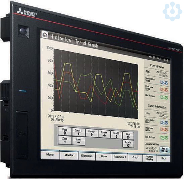 TFT-Display, 65 K Farben mit SVGA Auflösung und bis zu 128 MB internem Speicher. Das Gerät verfügt über Ethernet, USB, RS232 und RS422/485 Schnittstelle, sowie einen SD Kartensteckplatz. Zusätzlich kann das GT27 mit optionalen Schnittstellen wie CC-Link IE, CC-Link IE Field*, CC-Link, MELSECNET/H und einer direkten SPS Busanbindung ausgestattet werden. Es bietet umfangreiche vorgefertigte Diagnose- und Troubleshooting-Funktionen, wie Backup/Restore, SPS Programm Monitor, Device Monitor, Netzwerk Monitor, Servo/Motion Monitor, Motion SFC Monitor und CNC Monitor. Besondere Funktionen: Multi-Touch/Gestensteuerung, Multimedia Funktion, Debugging, Anzeigefunktion für Dokumente, Remote Zugriff auf das GOT (VNC-Server), GOT Mobile ? Webserver-Funktion, E-Mail, MES-Schnittstelle, FTP Server/Client, Operation Log, Datenerfassung, Multikanal, Transparent-Modus, Bediener-Authentifizierung, Backup/Restore, MELSEC-FX List Editor, Ablaufprogrammanzeige, Systemalarme, allgemeine Alarmverarbeitung, dezentraler Betrieb eines