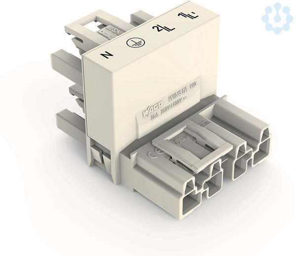 h-Verteiler. 4-polig. Kod. A. 1 Eingang. 2 Ausgänge. einseitige Abgänge. 3 Verriegelungsklinken. für fliegende Verbindungen. weiß