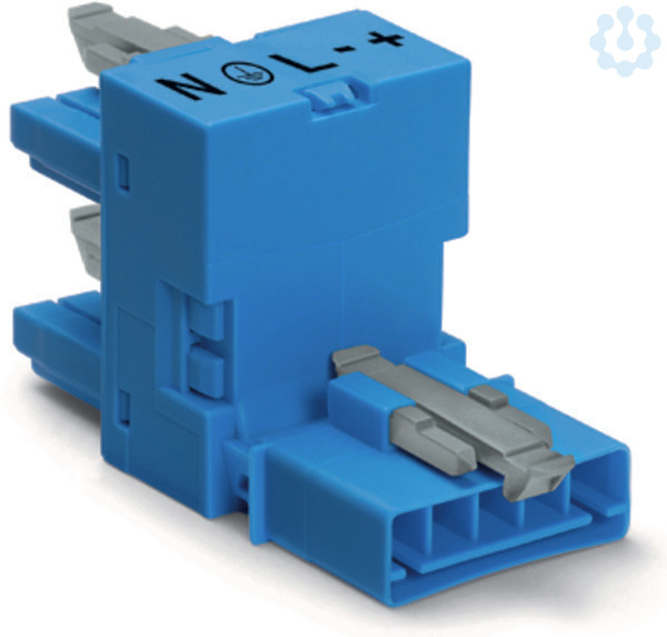 h-Verteiler. 5-polig. Kod. I. 1 Eingang. 2 Ausgänge. einseitige Abgänge. 3 Verriegelungsklinken. für fliegende Verbindungen. blau