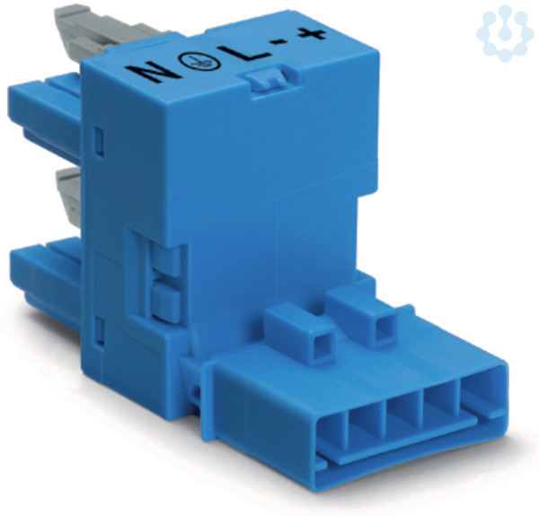 h-Verteiler. 5-polig. Kod. I. 1 Eingang. 2 Ausgänge. einseitige Abgänge. 2 Verriegelungsklinken. blau