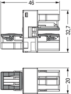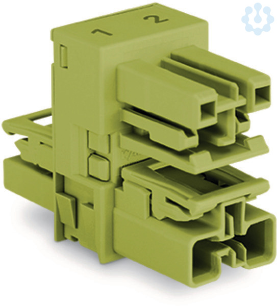 h-Verteiler. 2-polig. Kod. B. 1 Eingang. 2 Ausgänge. beidseitige Abgänge. 3 Verriegelungsklinken. für fliegende Verbindungen. hellgrün