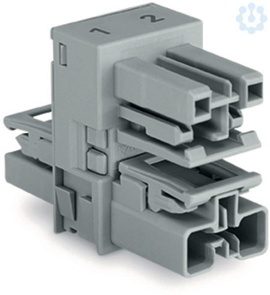 h-Verteiler. 2-polig. Kod. B. 1 Eingang. 2 Ausgänge. beidseitige Abgänge. 3 Verriegelungsklinken. für fliegende Verbindungen. grau