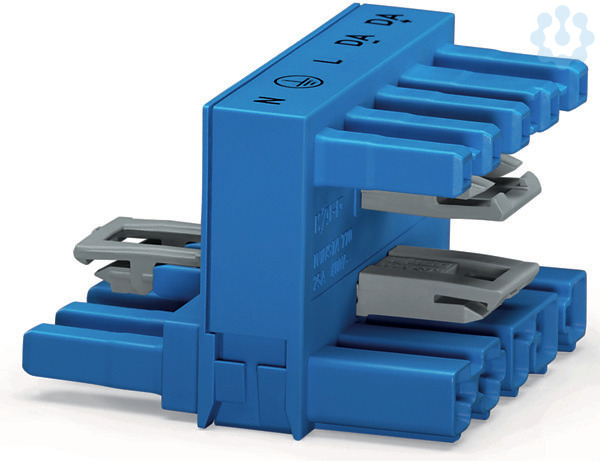 h-Verteiler. 5-polig. Kod. I. 1 Eingang. 2 Ausgänge. beidseitige Abgänge. 3 Verriegelungsklinken. für fliegende Verbindungen. blau