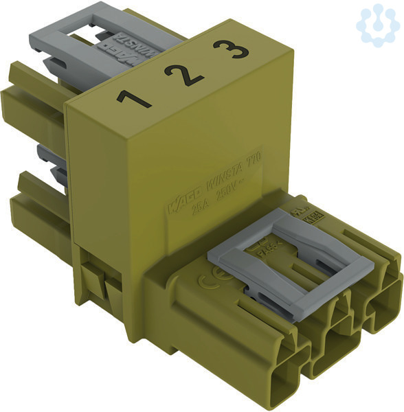 h-Verteiler. 3-polig. Kod. B. 1 Eingang. 2 Ausgänge. einseitige Abgänge. 3 Verriegelungsklinken. für fliegende Verbindungen. hellgrün