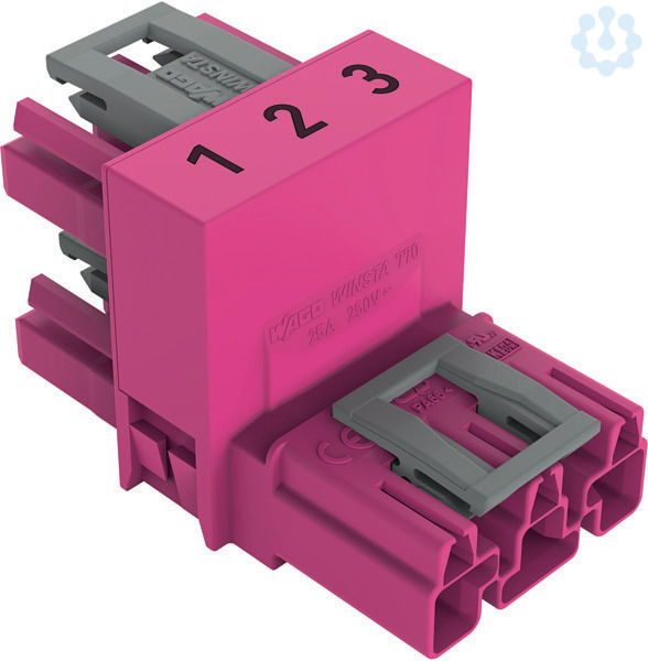 h-Verteiler. 3-polig. Kod. B. 1 Eingang. 2 Ausgänge. einseitige Abgänge. 3 Verriegelungsklinken. für fliegende Verbindungen. pink