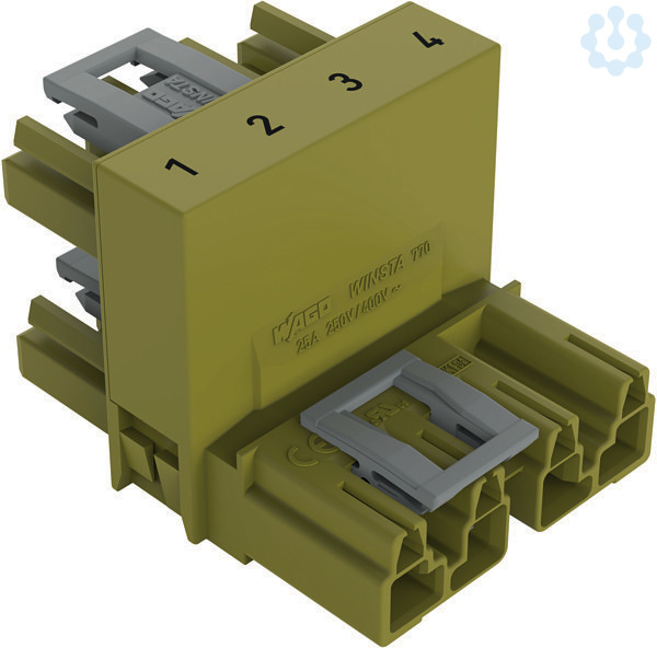h-Verteiler. 4-polig. Kod. B. 1 Eingang. 2 Ausgänge. einseitige Abgänge. 3 Verriegelungsklinken. für fliegende Verbindungen. hellgrün