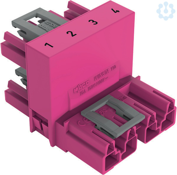 h-Verteiler. 4-polig. Kod. B. 1 Eingang. 2 Ausgänge. einseitige Abgänge. 3 Verriegelungsklinken. für fliegende Verbindungen. pink