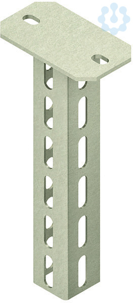 Hängestiel, 3-seitig durchgehend gelochtes U-Profil mit angeschweißter Kopfplatte, System HU 5050/..., für Ausleger zur ein-/zwei- und dreiseitigen Verlegung, um die Verformung des Hängestielprofils bei der Montage von Ausleger zu verhindern, ist aus statischen Gründen das Hängestiel-Distanzprofil HDS 50.50 C1KG mit Sechskantschraube zu berücksichtigen, bei einer einseitigen Befestigung des Auslegers am Hängestielprofil ist bevorzugt die geschlossene Seite des Auslegers fluchtend mit dem Profilsteg des Hängestiels anzubringen. Aus statischen Gründen und um ein problemloses Aufsetzen der Schutzkappe zu ermöglichen, muss der Ausleger im Abstand von x=50 mm (Auslegerunterkante bis Hängestielende), oberhalb des Hängestielendes montiert werden.