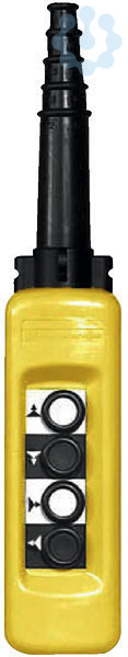 Hängetaster mit 4 Drucktastern für Steuerkreise. Diese Gelbe Kontrollstation ist doppelt isoliert und das Gehäusematerial aus Polypropylen. Es gehört zur Baureihe der Hängetaster Harmony XAC für 22-mm-Kunststoff-Signaleinheiten mit Durchmesser.