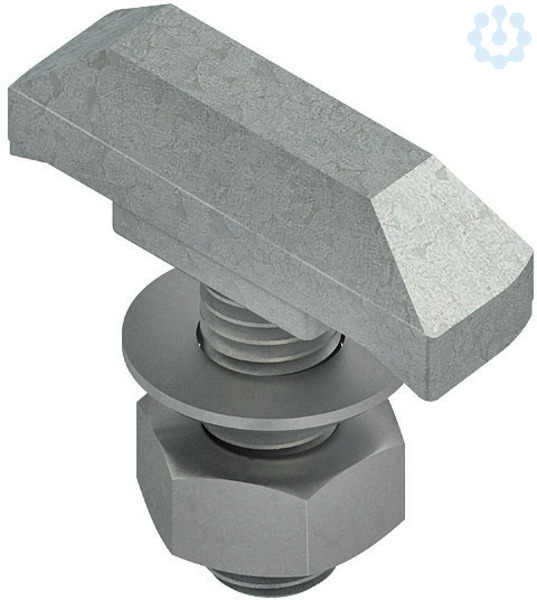 Hakenkopfschraube mit Sechskantmutter und Unterlegscheibe, an jeder Stelle im Profil einsetzbar.