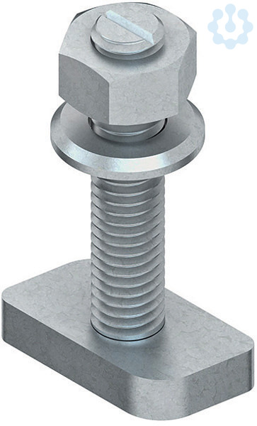 Hammerkopfschraube mit Sechskantmutter und Unterlegscheibe, an jeder Stelle im Profil einsetzbar.