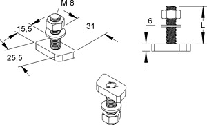 Hammerkopfschraube mit Sechskantmutter und Unterlegscheibe, an jeder Stelle im Profil einsetzbar.