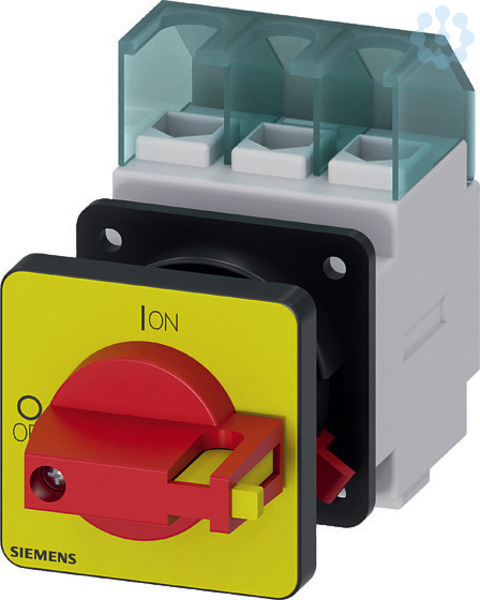 SENTRON, Lasttrennschalter 3LD, Not-Aus-Schalter, 3- polig, Iu: 32 A, Betriebsleistung / bei AC-23 A bei 400V: 11,5 kW, Frontbefestigt, Knebelantrieb, rot/gelb, Zentralbefestigung 22,5mm der Handhabe Der Haupt- und Not-AUS-Schalter 3LD als Reparaturschalter für eine sichere Abschaltung von Lasten in unterschiedlichsten Umgebungen. Die Einsatzmöglichkeiten der Netztrenneinrichtungen 3LD sind vielfältig. Nach Netztrennungen sorgen sie für die sichere Freischaltung der gesamten elektrischen Ausrüstung, schalten so zum Beispiel Drehstrommotoren, aber auch Klima- und Lüftungsanlagen. 3LD haben sich in vielen Bereichen bewährt, insbesondere in Be- und Verarbeitungsmaschinen des Maschinen- und Förderanlagenbaus, in der chemischen oder in der Nahrungsmittel- und Getränkeindustrie. Die Siemens Haupt- und Not-AUS-Schalter 3LD zeichnen sich vor allem aus durch: 1. Modularer Aufbau, schnelle einfache Montage von Hilfsschaltern, N- PE-Klemme oder 4. Pol. 2. Vielseitig und weltweit einsetzbar dank internationaler IEC-, UL-