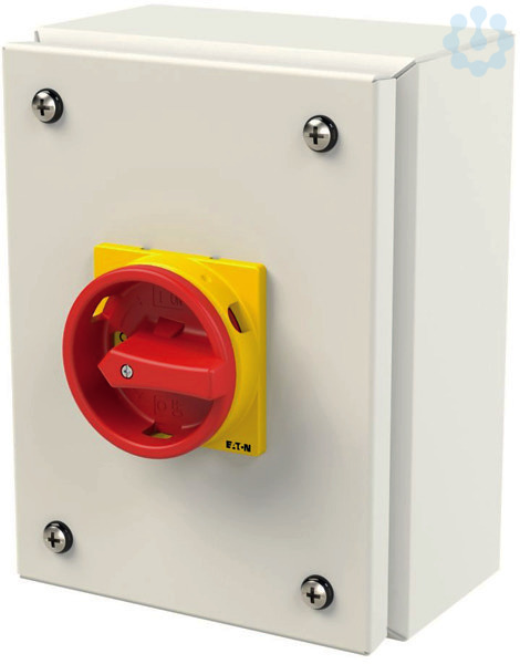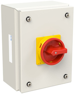 Hauptschalter, T0, 20 A, Aufbau, 3 Baueinheit(en), 6-polig, NOT-AUS-Funktion, mit rotem Drehgriff und gelbem Sperrkranz, abschließbar in 0-Stellung, im Stahlgehäuse