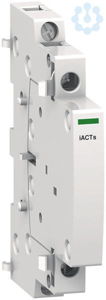 Hilfsschalter Acti 9 iACTs für Schütz iCT. 1 Wechsler, Betriebsspannung (Ue) 24-240V AC / 24-130V DC. Anzeige der Schaltstellungen OFFEN und GESCHLOSSEN der Kontakte des Lastkreises. Die Montage erfolgt linksseitig am iCT.