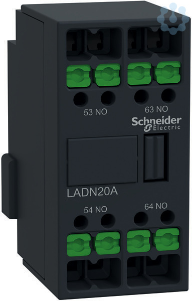 Hilfskontaktblock LADN. Unverzögerter Hilfsschalterblock für Schütze LC1D und Steuerrelais CAD. Es bietet 2 Schließerkontakte mit einer Nennspannung von bis zu 10 A, 690 V AC, Anschluss über SnapIN Klemme. Einfache Aufsteckmontage an der Vorderseite, für hohe Zuverlässigkeit und Haltbarkeit. Schnelle, sichere und wartungsfreie Stromverbindung mit SnapIN Anschlussklemme. Geeignet für Sicherheitsanwendungen durch mechanisch gekoppelte Kontakte und Spiegelkontakte.