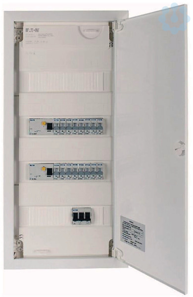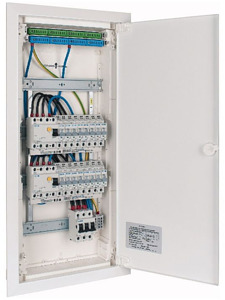 Hohlwand-Kleinverteiler KLV der zweiten Generation, Schutzklasse II, Kunststoff-Kapselung mit Stahlblechtür, Frontabdeckung plombierbar und laserbeschriftet entsprechend IEC/EN 60670-24, plus 2 Teilungseinheiten Reserve je Reihe, Markierungsschlitze im Mauerkasten, flaches Türrahmendesign, stabiler Türdrehriegel optional austauschbar durch Sicherheitsschließung, Kabelhalter für aufgeräumte Verdrahtung, optional in Projekte-Lieferform verfügbar, optional Tür mit Rahmen in RAL-Wunschfarbe, umfangreiches Zubehörsortiment, Lieferumfang: Gehäuse, Geräteträger, Frontabdeckung, Null- und Schutzleiterklemmen mit KSK Steck-Klemmtechnik, Libelle, 3D-Putzausgleich mit bis zu 18mm Tiefenausgleich, Kabelhalter, Hohlwandanker, Montageanleitung, Beschriftungsbogen, praxisgerechte Spezialverpackung, verdrahtet, 5opl-KLemmblock + 18TE Reserve, 2 Reihen je 1x PXF-40/4/003-A, gebrückt auf 8x PLI-B16/1. Normen: Entsprechend IEC/EN 60670-24, DIN 43871, IEC/EN 62208 und somit für Verteilungen nach IEC/EN 61439-3 freigegeben.